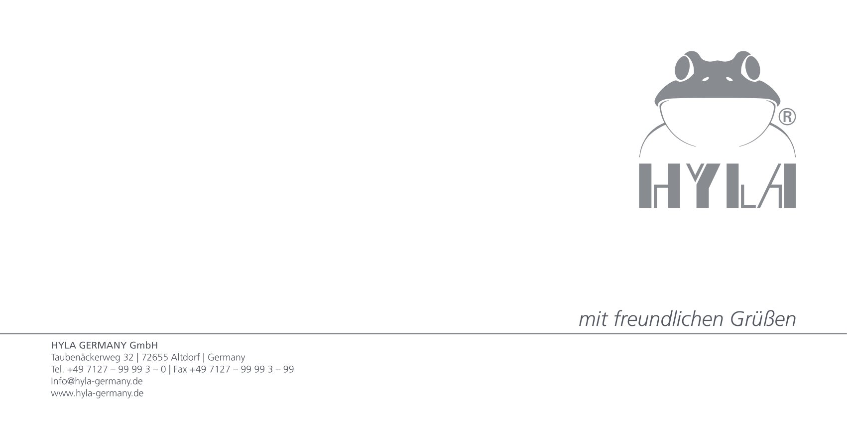 – An HYLA Germany GmbH, Taubenäckerweg 32, D-72655 Altdorf, info@hyla-germany.de, Fax: 0711 - 25 26 43 30